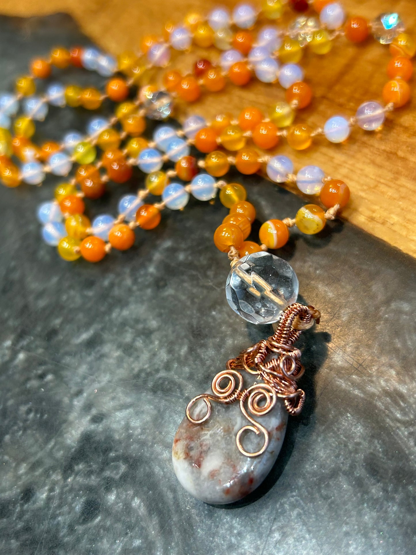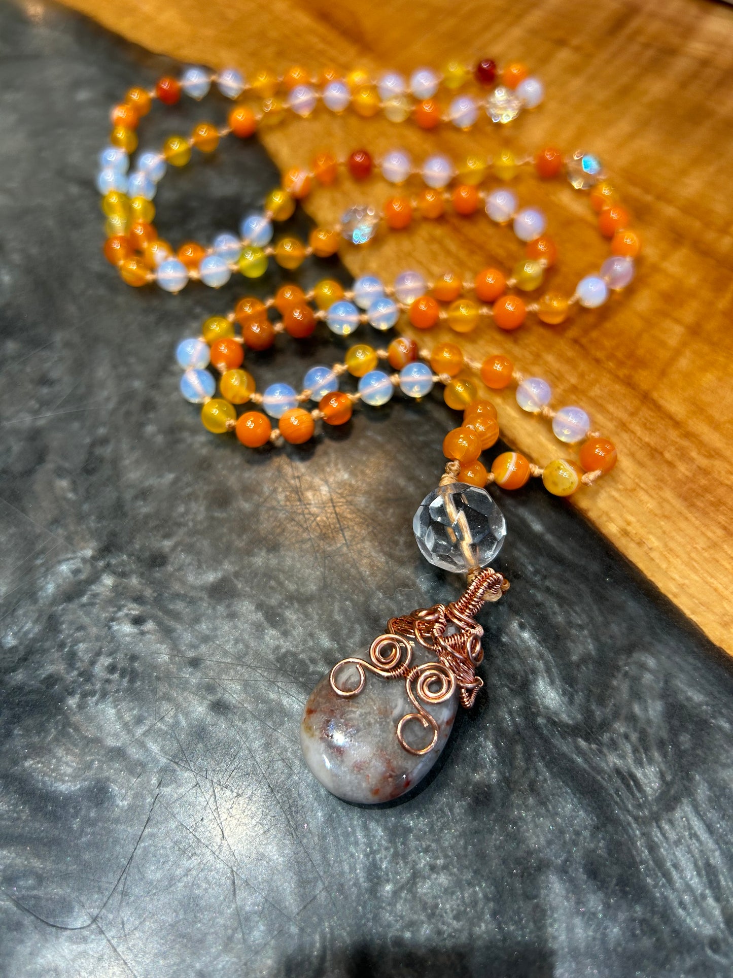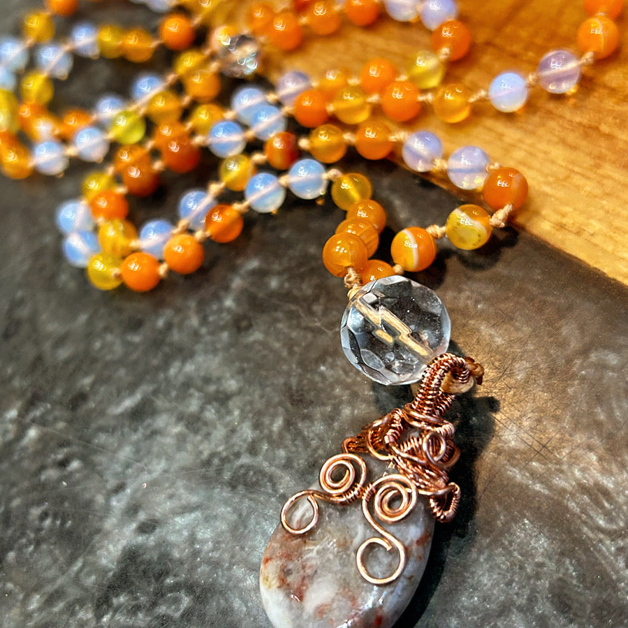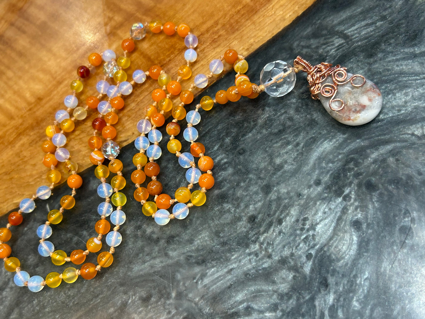 Mala necklaces are strands of beads , usually made from gemstones, wood or seeds traditionally used in meditation practices. They typically consist of 108 beads. Which hold spiritual significance in Hinduism and Buddhism. The beats are used to count breaths or mantra repetitions during meditation. Typically the 109th bead, called the guru bead, signifies the end or beginning of a meditation session. Mala necklaces can also serve as a reminder of intentions or affirmations. Choosing a Mala often involves selecting materials with properties that align with one’s intentions or spiritual goals
