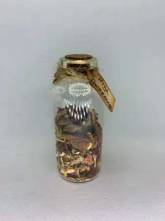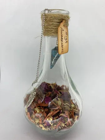 High Awareness: Frankincense, included in this particular bottle is used to become aware of the universe, stimulates psychic power and produces protective vibration. Perfect for those who practice reiki or those who do readings. The large and extra- large bottles can contain Amethyst and/or Apatite to help with their energy.