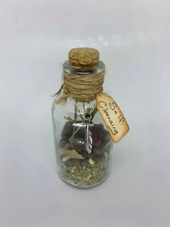 The thyme incorporated in this bottle attracts loyalty and the marjoram is used to cleans, start fresh. A little clove will stop gossip. The large and extra-large bottles may contain citrine and/or amethyst to help with their energy.